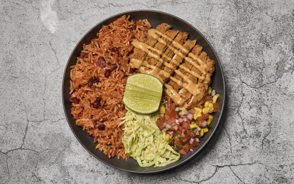 Pollo Crujiente Bowl: Sprødstegt kylling, ris, pico, sprødkål
